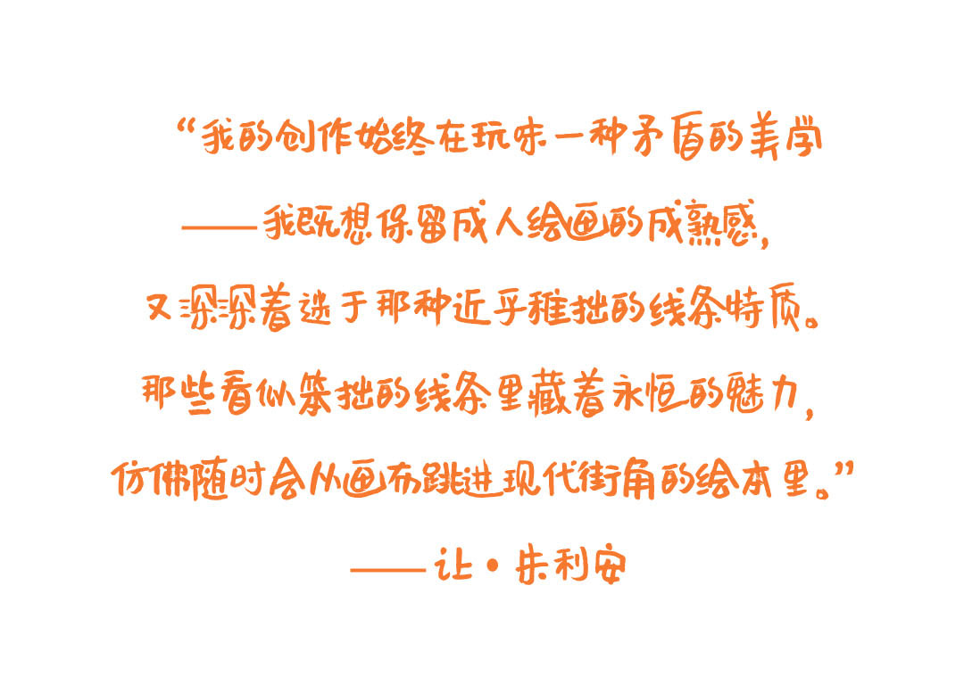 我的创作始终在玩味一种矛盾的美学 —— 我既想保留成人绘画的成熟感,又深深着迷于那种近乎稚拙的线条特质。那些看似笨拙的线条里藏着永恒的魅力,仿佛随时会从画布跳进现代街角的绘本里。这种极致简约的笔触,其实是对传统法国绘画的温柔反叛:当古典艺术在追逐精准的光影与透视时,我的线条却在编织逃离现实的密道。