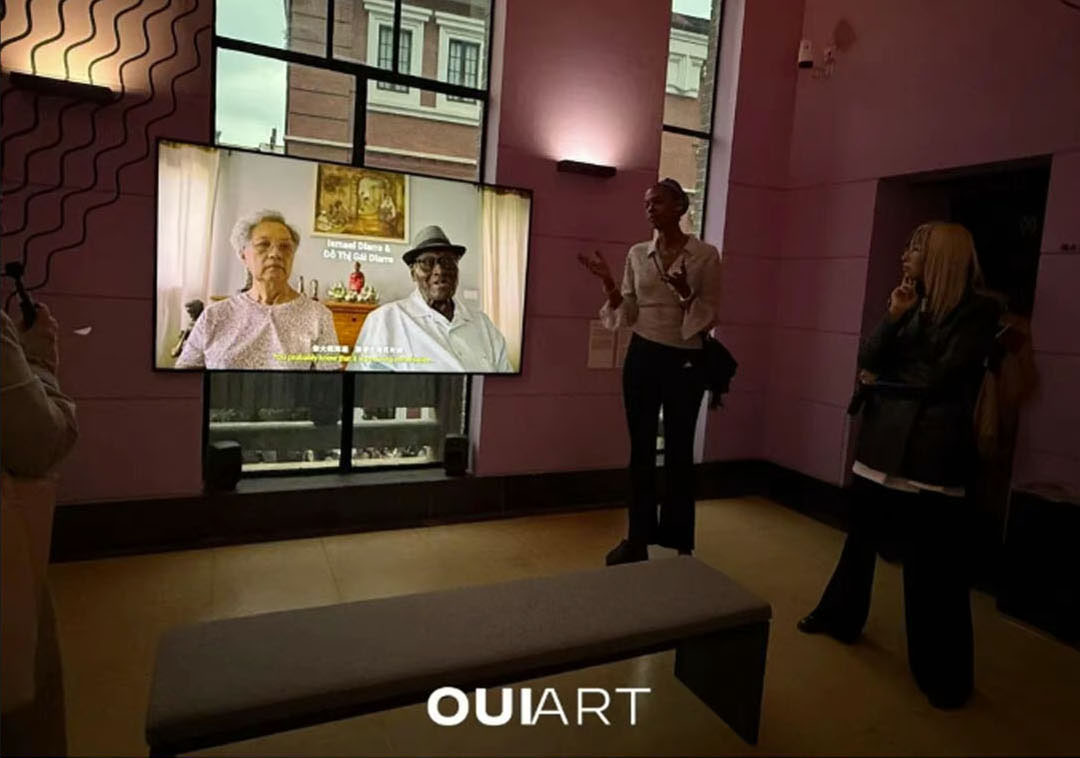 位于展厅入口的流动区域此刻被笼罩在一片荧红色的暧昧氛围中,然而窗前屏幕上所播放着的有关战后混血族群和殖民抵抗的档案影像《母亲、混血、记忆》(2019-2022)却似迷雾中快速飞过的利刃,越南艺术家阮俊(Tuấn Andrew Nguyễn)划破并召唤出一段劣迹斑斑的幽灵历史。依稀间,时间回到上世纪越南战争的背景下,当时的法国殖民军在非洲塞内加尔征召的雇佣军“塞内加尔射手”(Tirailleurs sénégalais)在驻扎期间对越南女性犯下罪行,由此牵连出一系列关于受害者与共谋、“混种”与跨国家庭的认同错乱和记忆创伤等关键症结。