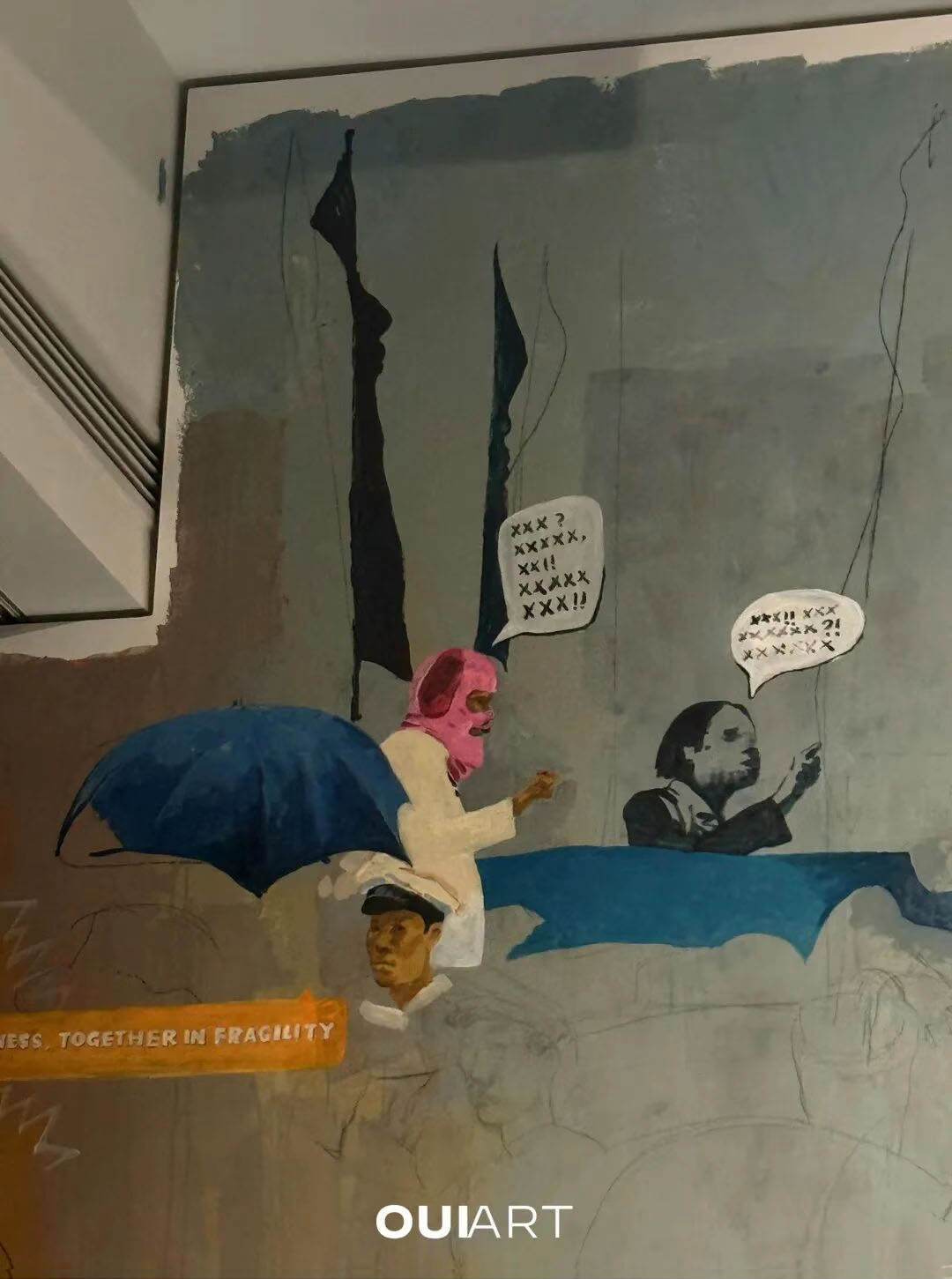 作为展览提出的问题之一,在接下来位于四楼的展厅中显影为若干个以社群为单位的隐秘回应。44月报是其中一个常年流动于广州的集体写作团体,他们的写作形式包括但不限于文字、空间、壁画、装置、影像、表演和出版等可延续的表达,成员也一直处在变化当中。同样是受任创作四楼空间的前厅,有着天然的两层楼挑高和顶部自然光条件的空间倏然成为一处繁忙的、临时的、颠乱的假想街头,似极华南乃至北非社区的聚居地景。44月报的《颠倒车站》(Viparyāsa Station,2025)通过还原出水泥格栅、雨棚和大面积涂鸦,将展览伪装成一处光怪陆离的精神避难所,并将所有的苦与乐内化为未完成的遭遇和创伤修复的力量,从而拼合出了一种穿透时间和固有经验的团结自治。