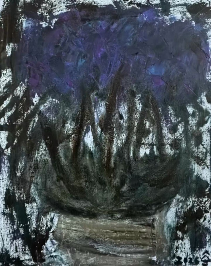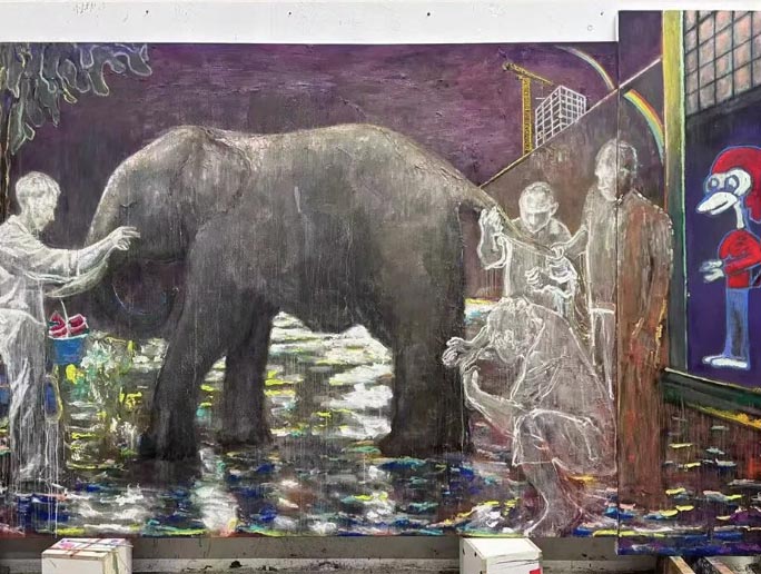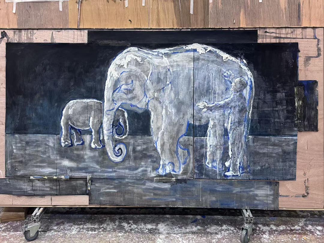 伴随这幅作品的推进,我渡过了2025的大部分时间。时间在流动,意识也在流动。画画无非就是在流动中抓取可以确定的东西。在变幻和确定的冲突中,时而狂喜,时而跌入谷底。也许因为象是吉祥之相,在这幅作品的创作中,我更多体会的是:无限的遐想与惊喜。