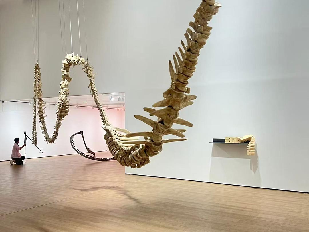 近期在深圳湾厦艺术中心有一个正在展期中的我的个展。其中有一件为本中心空间针对性创作的装置作品:《所有形式都顺从引力,甚至想象也是缺席的》。它们由18个不同物种(包含人类以及还未被灭绝的其他动物)构成的总长近21米长的脊椎共生体。它们被吊挂在空中,在隐形的引力控制中垂下……