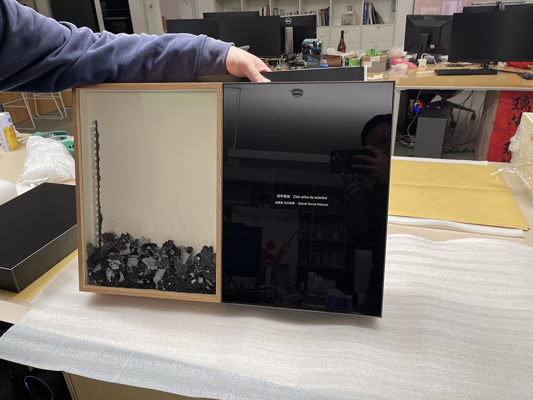 当我看到吾乙艺术发我的新春特辑的分享邀约时,我有一件与时间有关,每天清晨连续不断进行工作的最新系列作品之《遗忘比记忆更久远——百年孤独》几乎完成了,就等着视频记录编辑与行为“证物”的最后组装呢!这个系列是从2019年底开始的,迄今已完成了七部,非常耗时耗力。创作的基本形式是:在同一张纸上,抄写一篇文本(包含哲学专著、小说等),当抄满全页时将抄写的文字擦除,并将擦除的灰烬保存,然后重新继续抄写文本,然后继续擦除,继续保存灰烬,依次类推,通常,当一篇文本全部抄写完成时,纸因为不断𠄘受抄写的压力和擦除的重压,会变得非常脆弱,破烂不堪。它们就像一种肉身的隐喻,在不断接受信息的进程中最终又被信息吞噬!