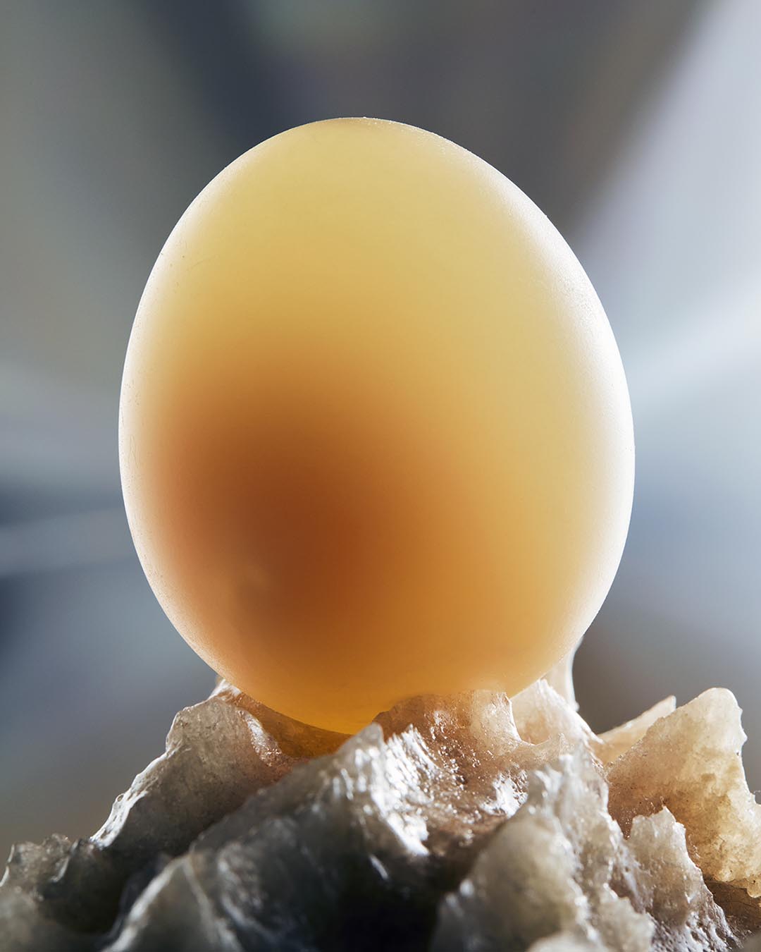 被剥掉壳的生鸡蛋矗立在盐块上,鸡蛋里若隐若现的白色系带显示了蛋的新鲜程度,盐块的形态如同山脉的走势,延伸到图像之外不可触及的地方。鸡蛋的吹弹可破和盐块的锋利形成了角力,角力的背后是个体生命意志面对冷硬规制持续的坚挺和对峙。