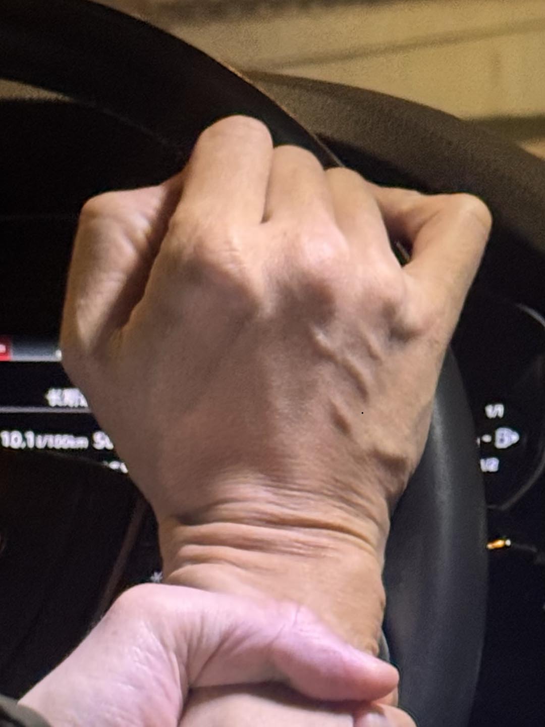 这是我开车时的手,为了拍出超速行驶时那种血管爆棚的力量感,我故意攥紧手腕做了个草稿照片。受行动者网络理论的影响,我一直觉得物体不只是背景,而是权力的代理——它能把无形的规则变成具体的阻力。我想拍出人在操纵物体时,身体是如何被这些东西反向重塑、甚至挤压变形的。